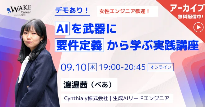 Cynthialy株式会社 生成AIリードエンジニアの渡邉茜(べあ) さん(@beardahlia05)をお招きし、AIを活用した要件定義の進め方や設計の考え方や実際の開発フローを、サンプルデモを交えながらわかりやすく解説。